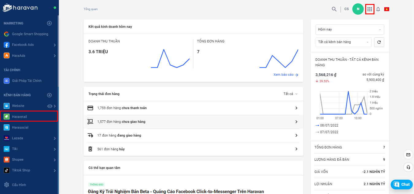 Đăng nhập vào trang quản trị Omni, tại mục Kênh bán hàng, bạn chọn HaraRetail -> chọn Trải nghiệm HaraRetail. Hoặc bạn chọn vào icon menu trên góc màn hình và sau đó thực hiện đăng nhập vào HaraRetail
