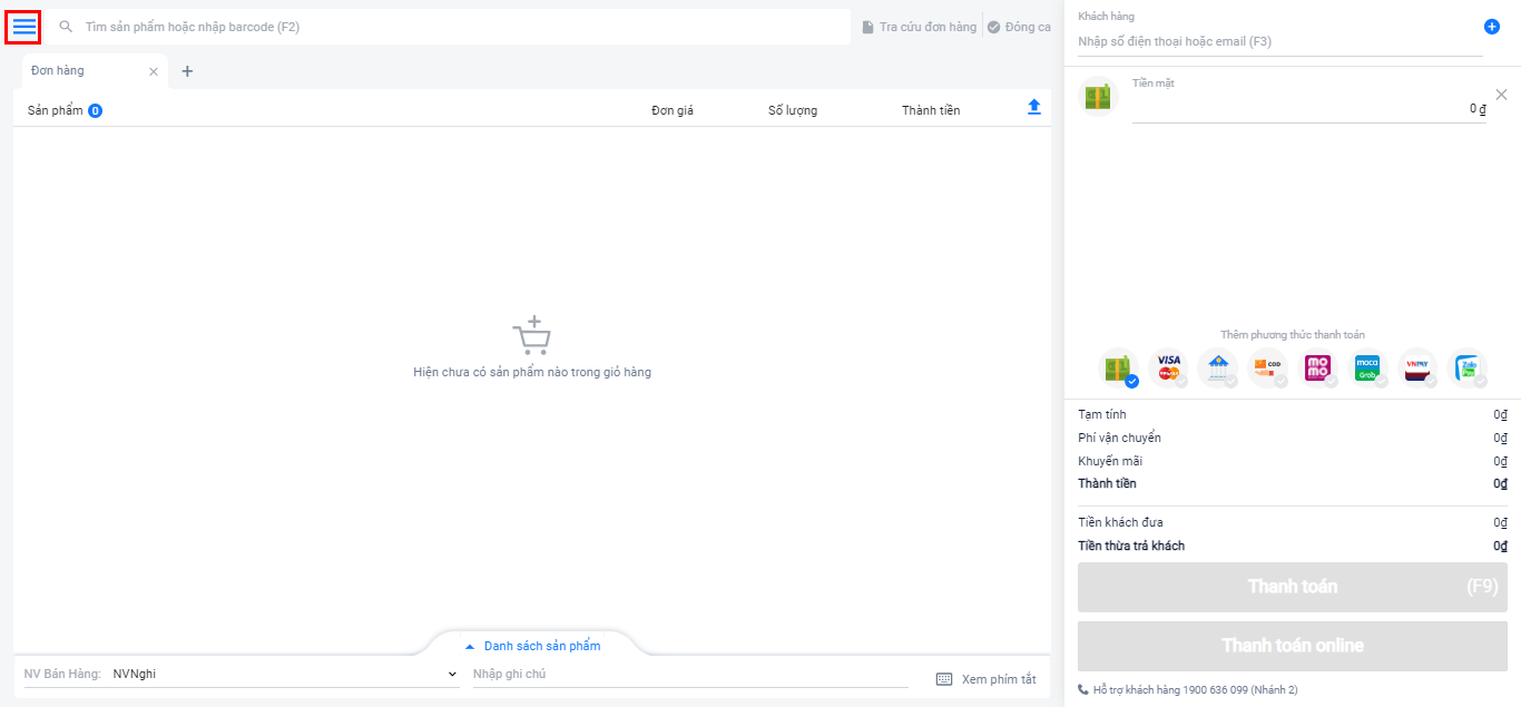 Trong menu, Nhà bán hàng chọn Quản lý ca và bắt đầu thực hiện các thao tác bán hàng và quản lý ca trực.