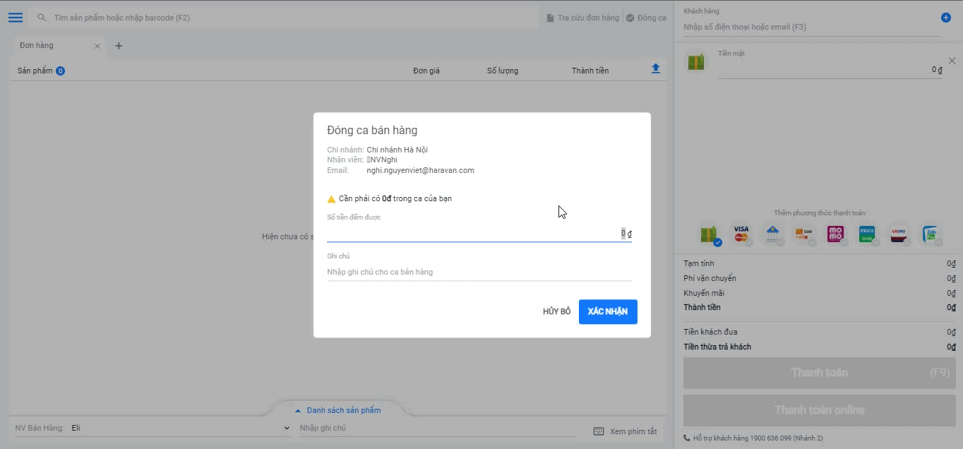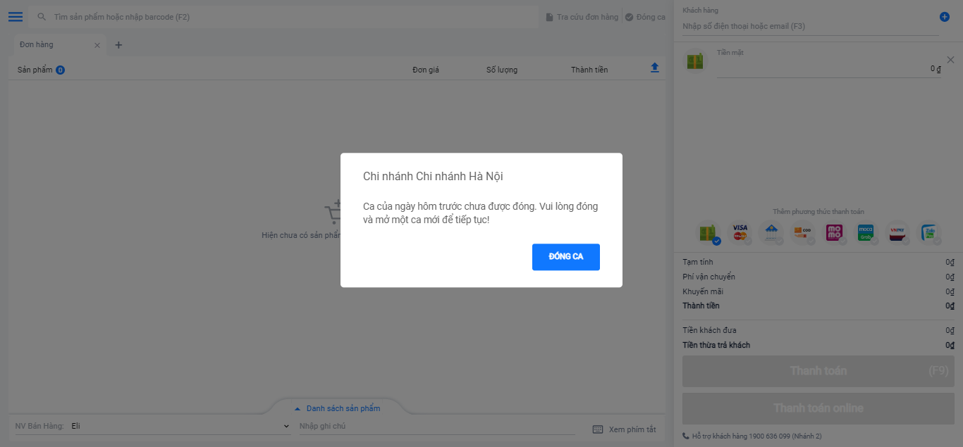 Lưu ý: Chức năng mở ca chỉ có thể được thực hiện khi ca bán hàng trước đó đã được đóng ca.