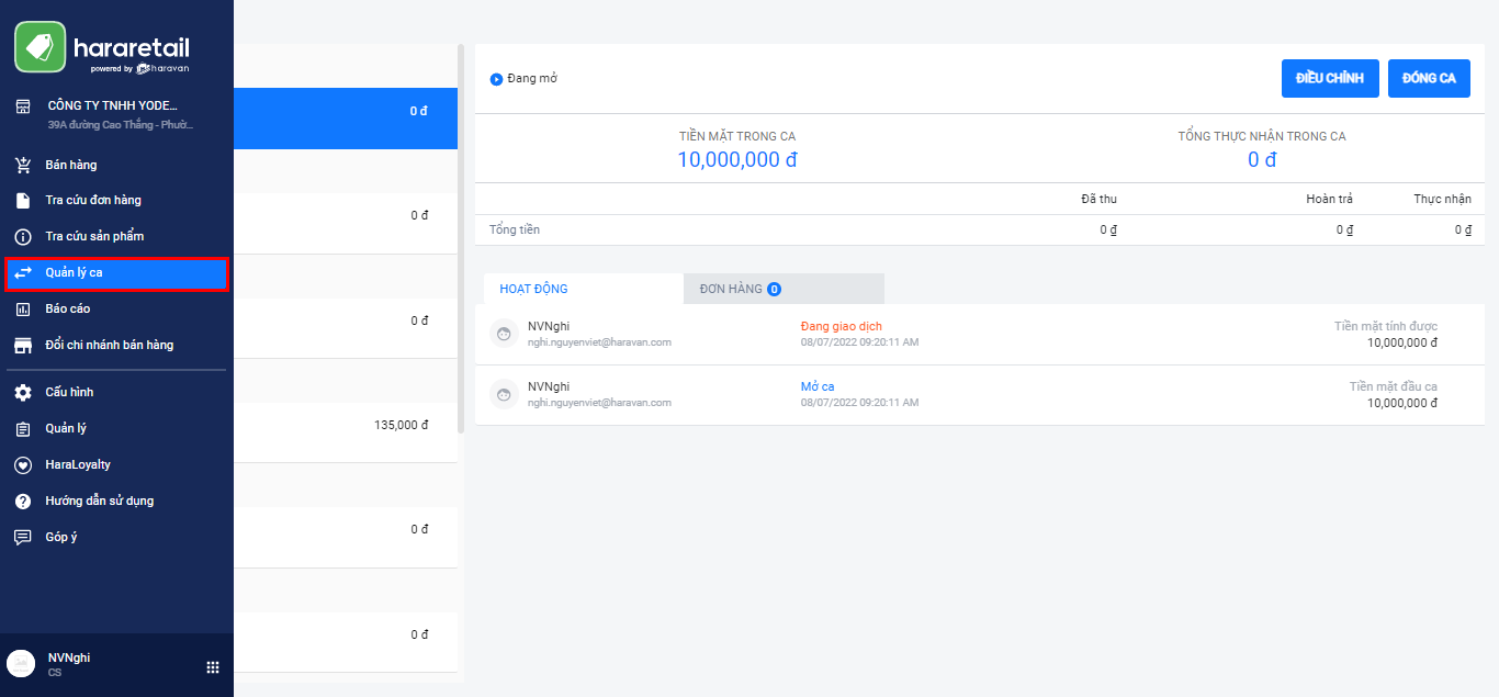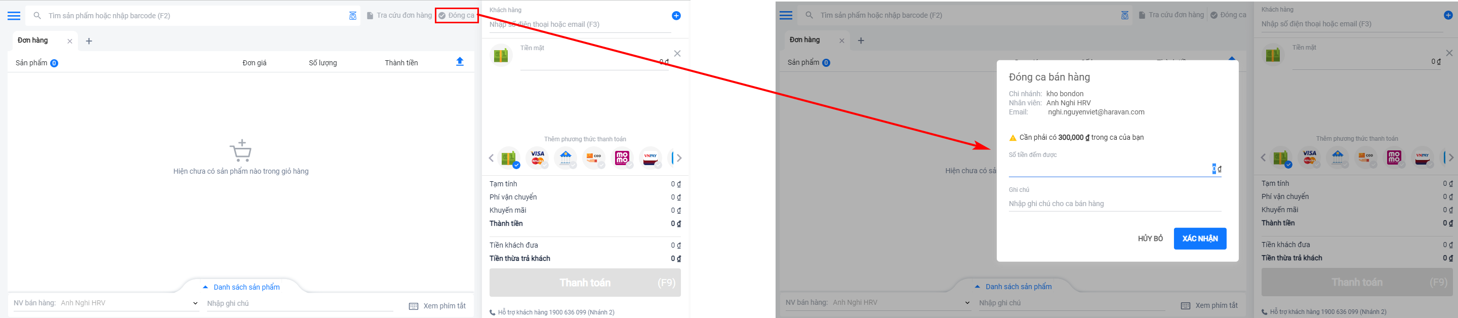 Khi thực hiện bán hàng tại cửa hàng, quản lý ca là một thao tác cần thiết để Nhà bán hàng theo dõi ca trực của nhân viên và quản lý doanh thu của cửa hàng trong từng ca trực.