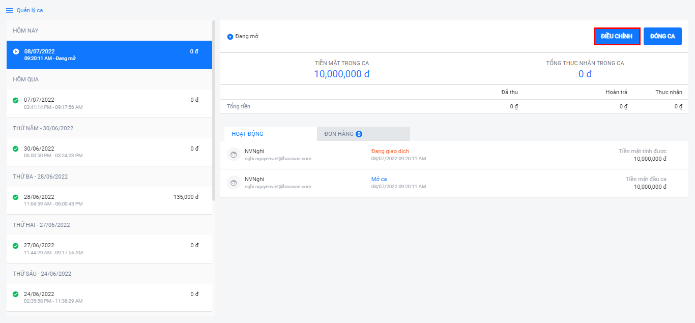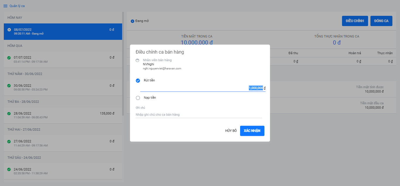 Sau khi điều chỉnh, hệ thống sẽ tự động ghi nhận lại thời gian thực hiện, nhân viên thực hiện, và số tiền điều chỉnh trong lịch sử hoạt động của ca bán hàng.