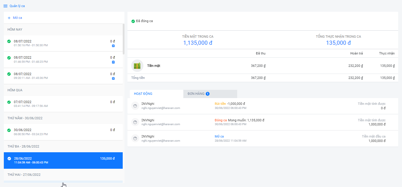 - Phần bên phải là hoạt động trong ca bán hàng đó.