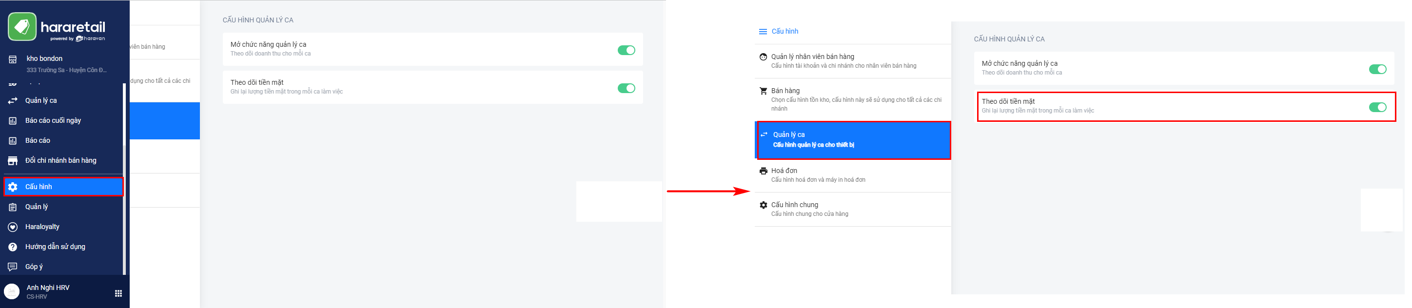 - Để có thể quản lý ca, nhà bán hàng cần bật chức năng quản lý ca trong phần cấu hình. Để xem hướng dẫn cấu hình chức năng chuyển ca, Nhà bán hàng vào đây.