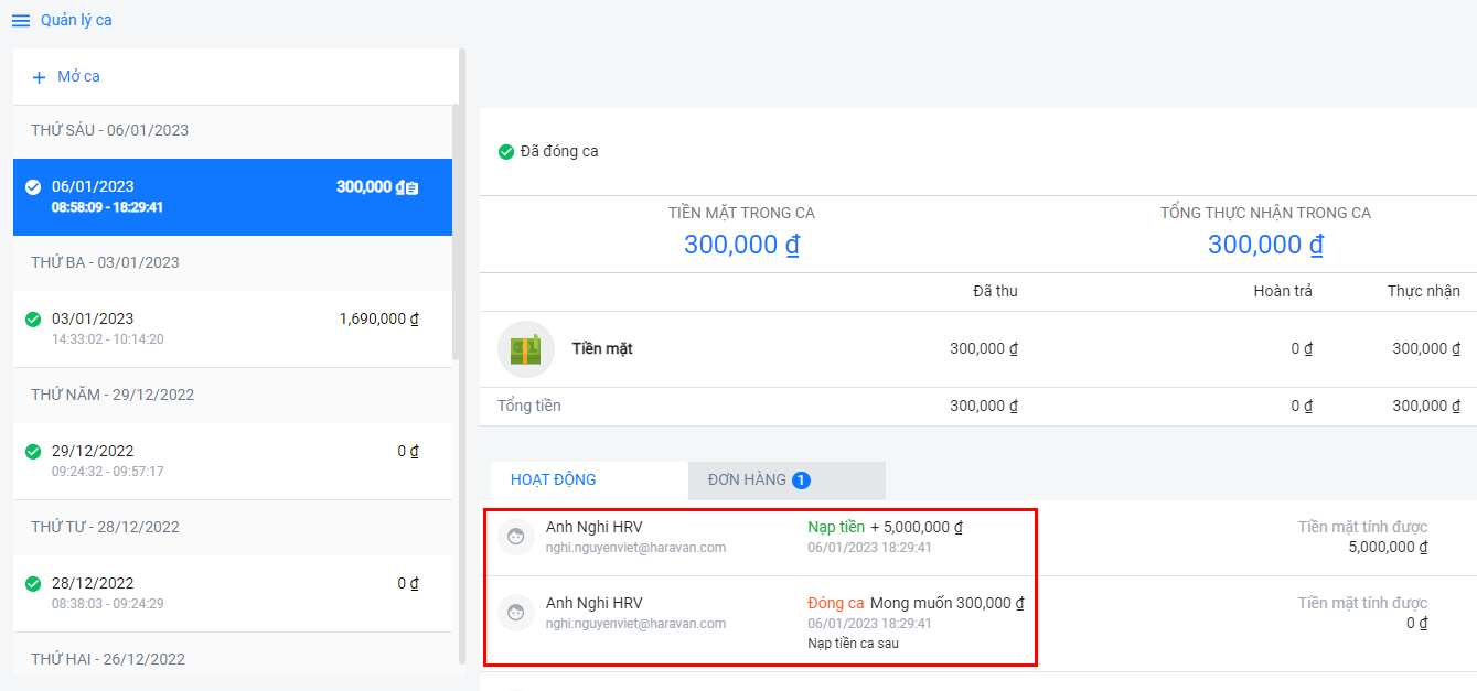 Bạn có thể xem lại hoạt động này trong phần Quản lý ca