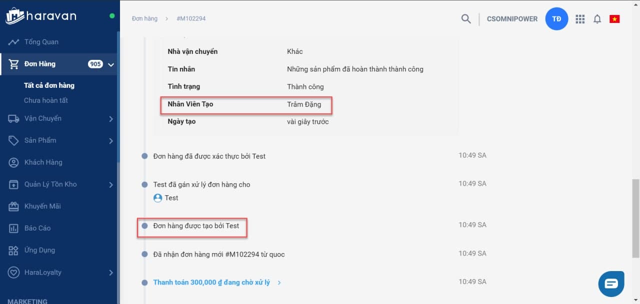 • Trong lịch sử đơn hàng, mục Nhân viên tạo sẽ chỉ ra nhân viên nào là người tạo vận đơn. Mục  Đơn hàng được tạo bởi sẽ cho bạn biết nhân viên nào là người tạo ra đơn hàng đó.