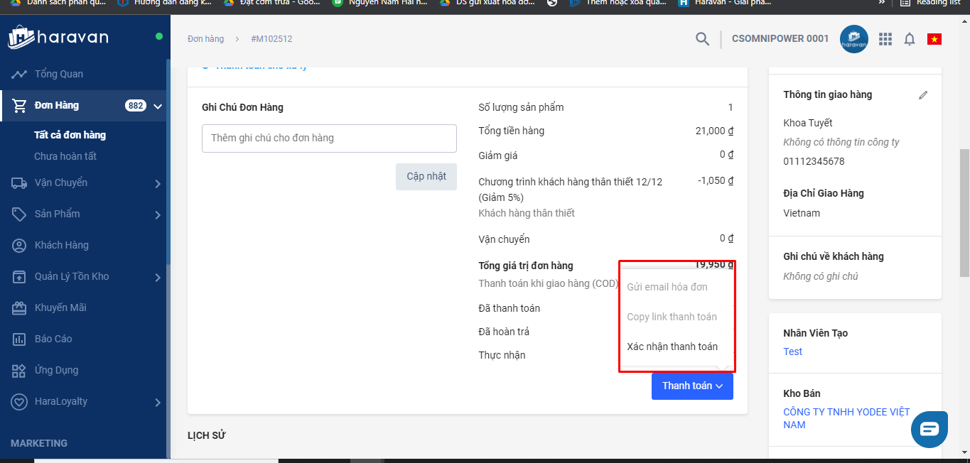 Sau đó, cập nhật lại trên hệ thống để đánh dấu đơn hàng đã được xác thực.